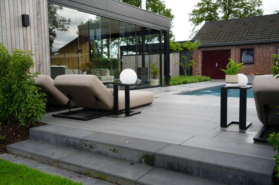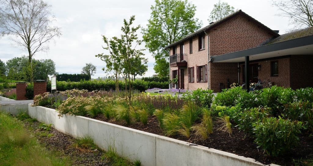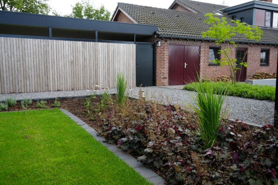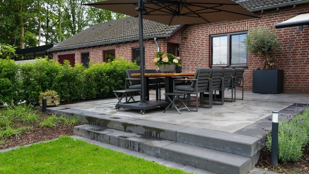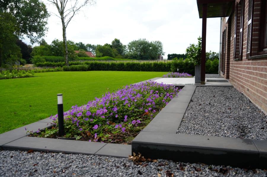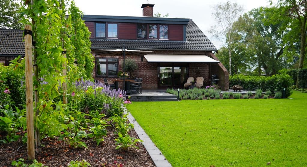Na de woningrenovatie wilden de bewoners een tuin waar natuur en ontspanning samenkomen. We startten met het opruimen van de oude begroeiing en brachten nieuwe structuur aan met teeltaarde, keramische tegels, halfverharding en gebakken waaltjes. Betontraptreden zorgen voor speels hoogteverschil, terwijl oude bomen en nieuwe beplanting, van solitairen tot hagen, zorgen voor een groene, landelijke sfeer.