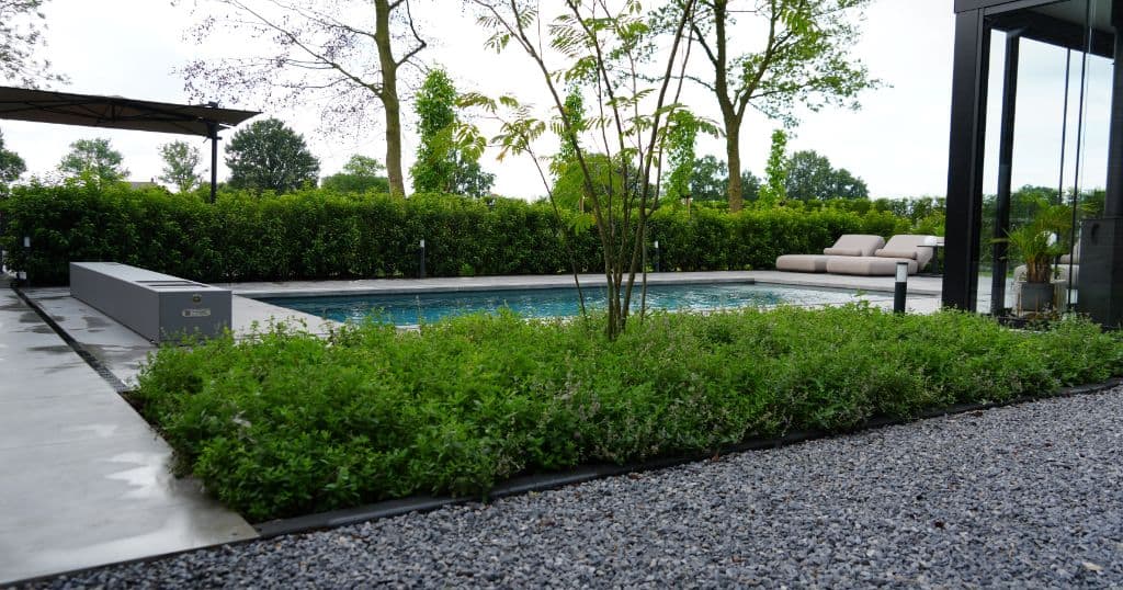 Achter een bosrand in Horst transformeerden we een verwilderde tuin tot een open, groen paradijs met strakke lijnen en een zwembad met poolhouse als stralend middelpunt.