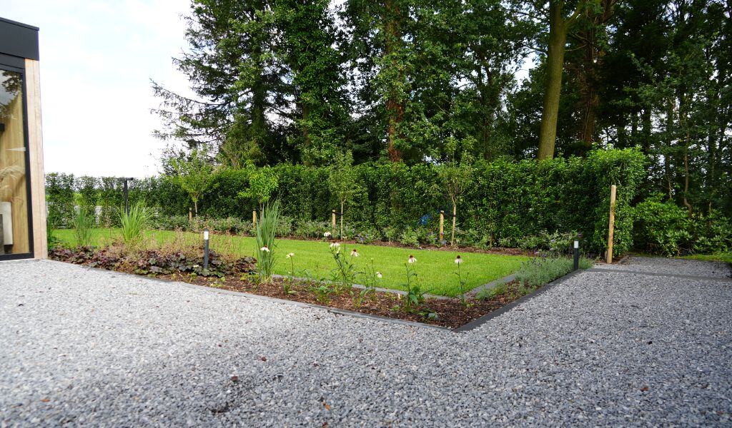 De tuin vloeit moeiteloos over in het privébos erachter: een plek waar rust, ruimte en natuur samenkomen.
