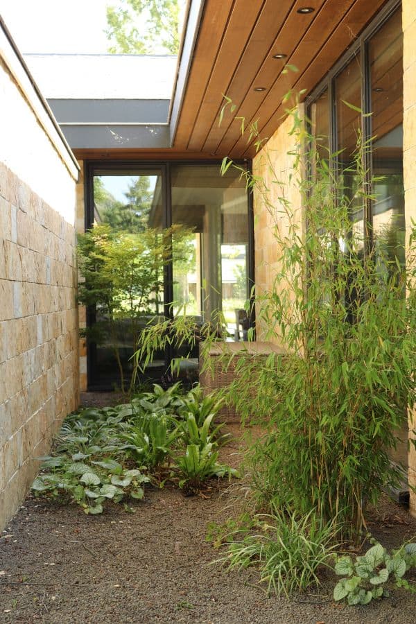 De bewuste keuze voor lavagranulaat in plaats van traditioneel gazon zorgt niet alleen voor minimaal onderhoud, maar creëert ook een unieke textuur die het hele jaar door interessant blijft. De weelderige prairiebeplanting trekt vlinders en bijen aan.