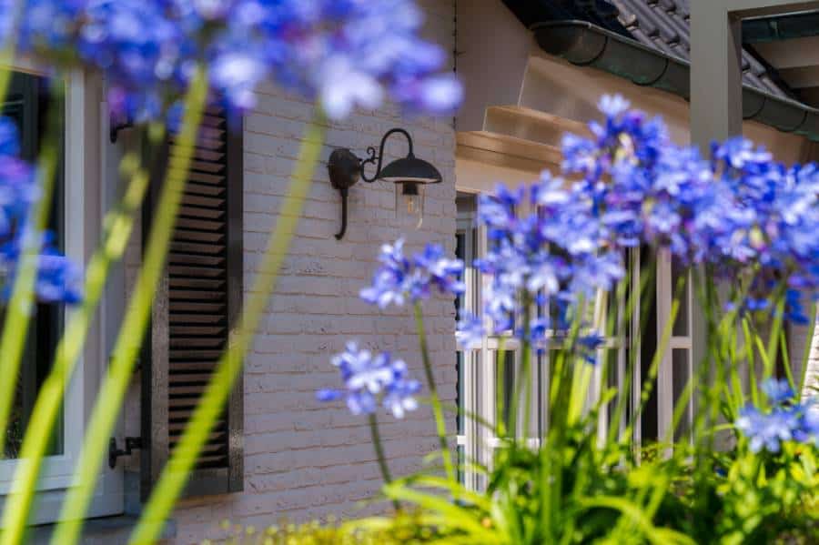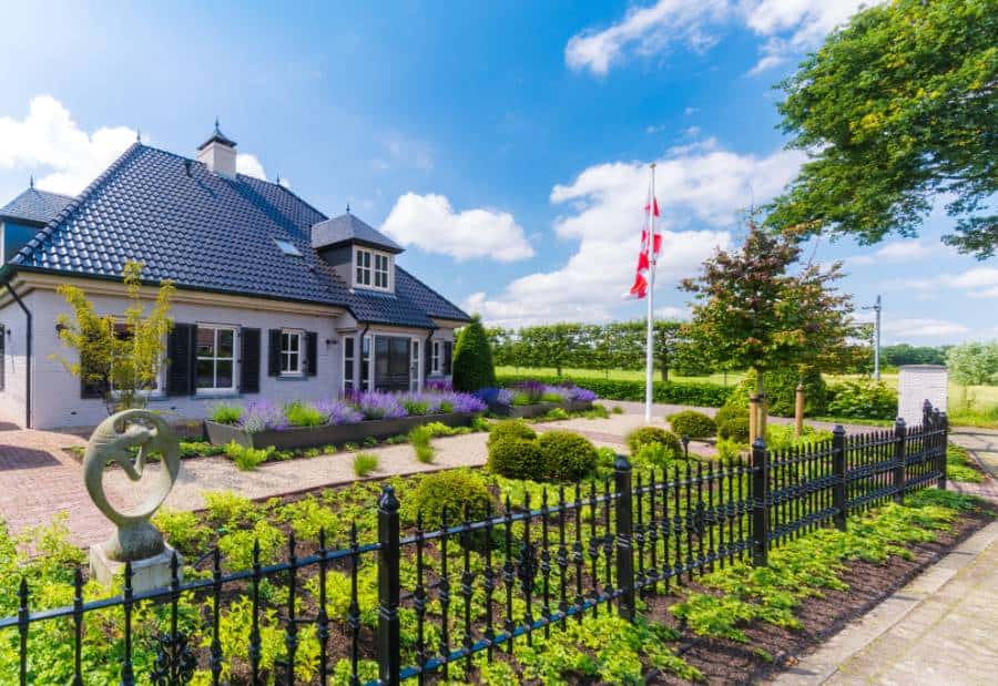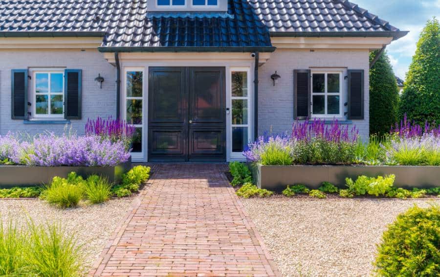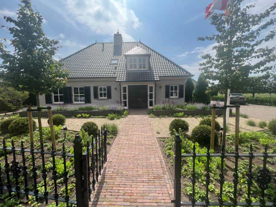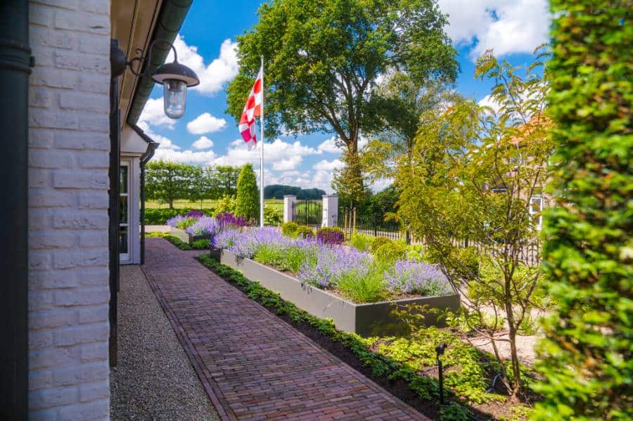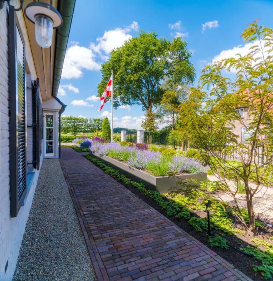 De voortuin bij deze landelijk gesitueerde woning is opnieuw ingericht, waarbij de goedgevulde, verhoogde borders bij de entree in het oog springen.
