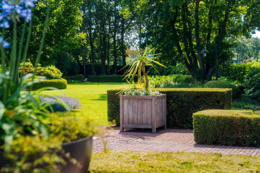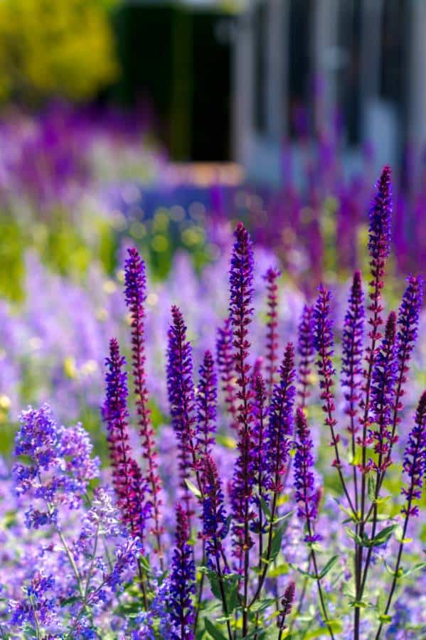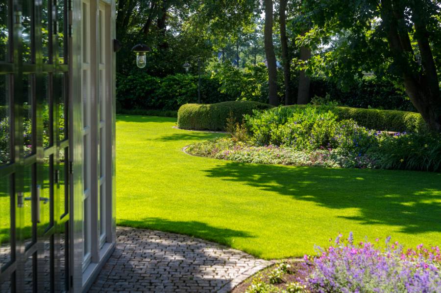 De beplanting in deze tuin bloeit uitbundig en vraagt weinig onderhoud. De organische snoeivormen zorgen voor een overgang naar het landelijke achterdeel van de tuin.