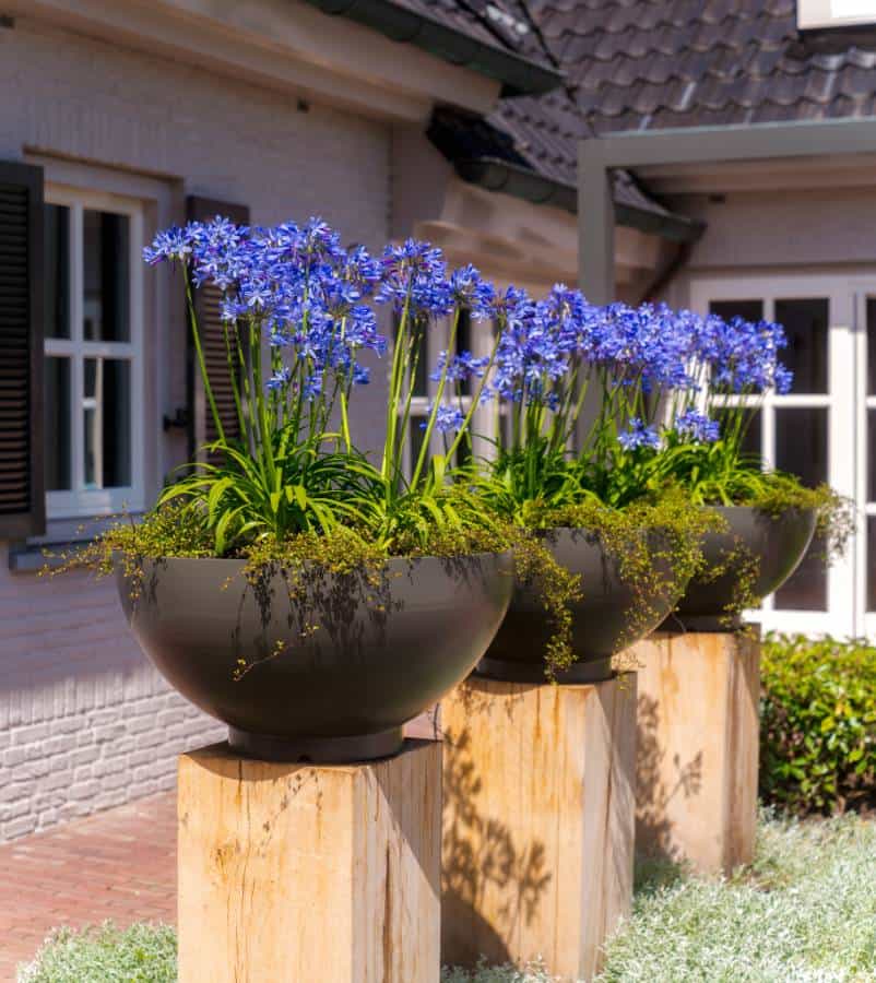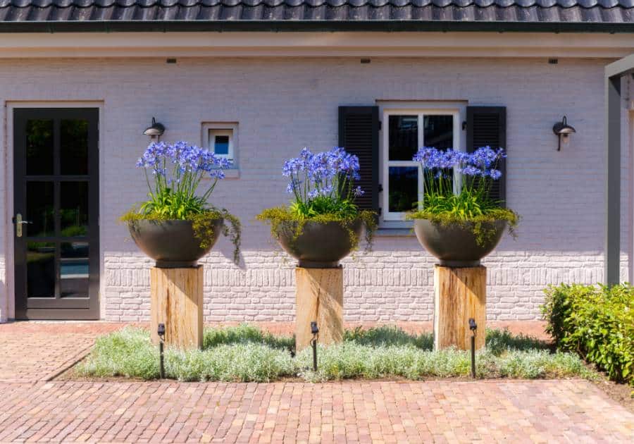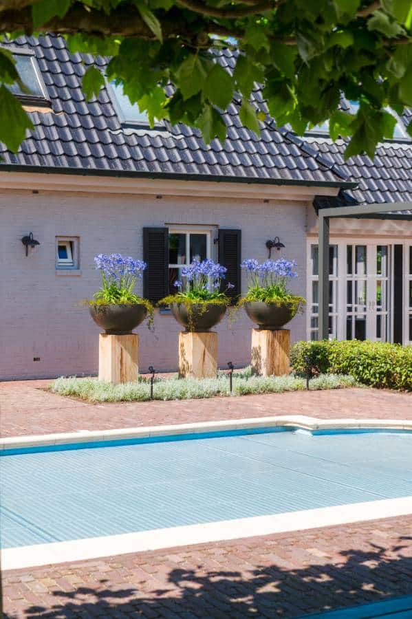 In de border bij het zwembad staan halfronde schalen op eiken sokkels, die ’s avonds subtiel worden aangelicht.